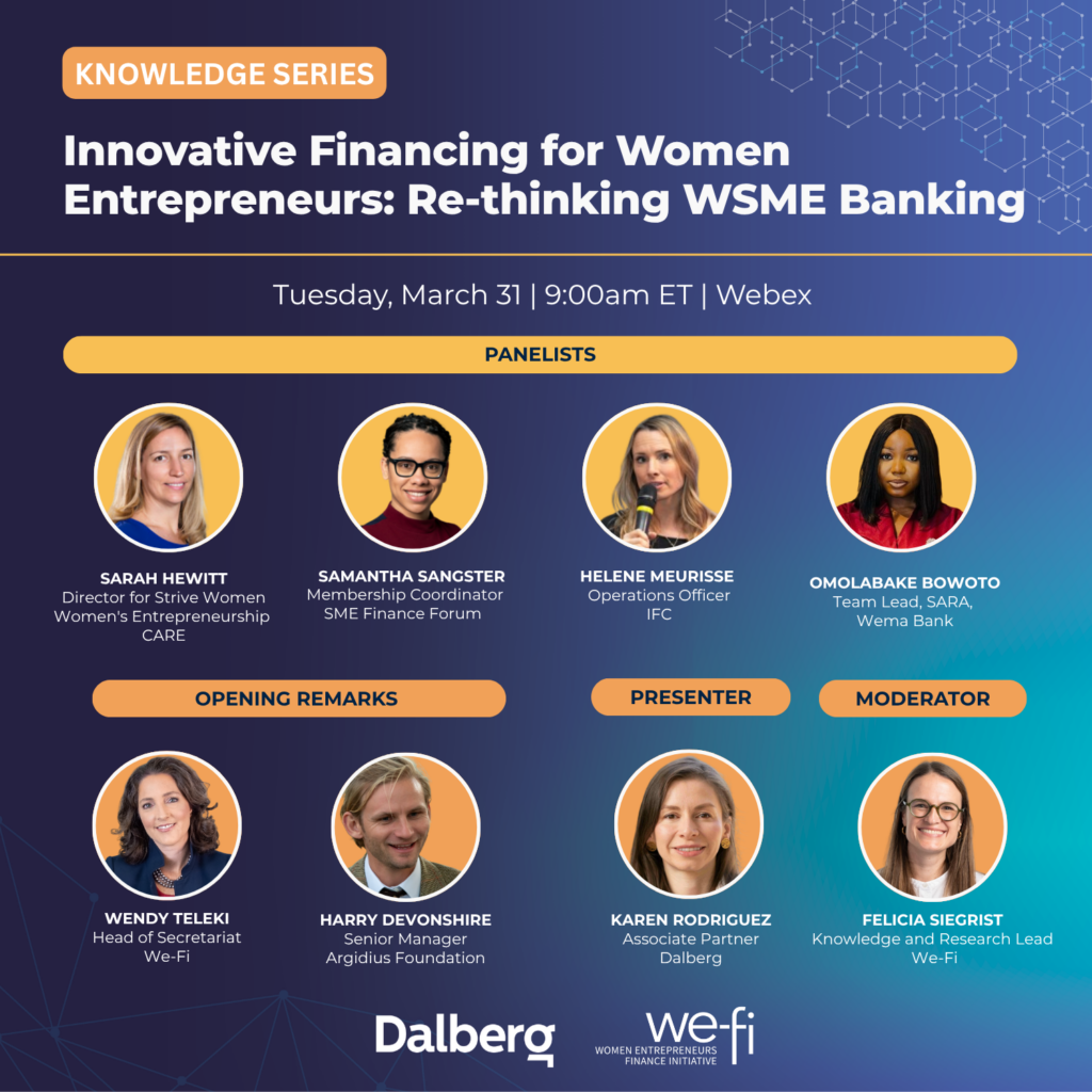 Objective: The objective of this webinar is to showcase innovative tools and resources to help financial institutions better design and tailor their products to women-owned and led businesses. The webinar will highlight what has proven effective in strengthening banks’ ability to serve women‑led SMEs, including gender‑responsive customer segmentation, improved credit assessment methodologies, innovative finance instruments, and complementary non‑financial services. More specifically, it will present a new knowledge product developed by Dalberg, in collaboration with We-Fi and Argidius Foundation, that maps WSME-specific products, services and existing gaps in the offering. Distinct products and services were categorized by lifecycle stage, to better target different segments of WSMEs.